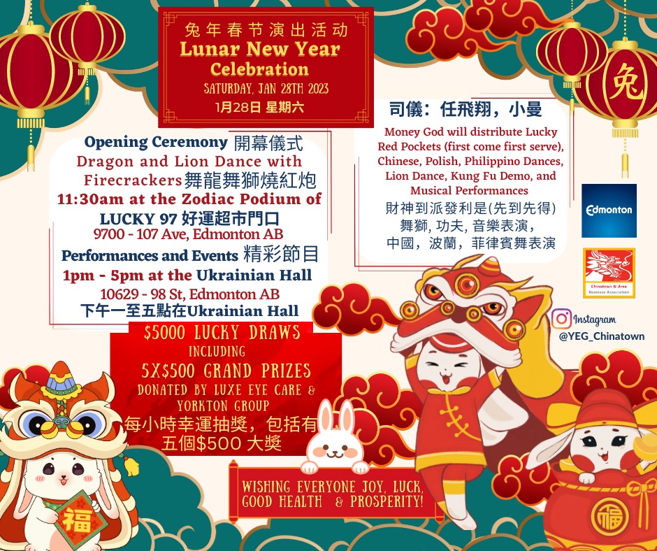 Londonderry Mall 137 Avenue & 66 StreetCelebrate Lunar New Year of the Rabbit at Londonderry Mall East Court (66 Street Entrance) Lion Dances, Music, Arts & Crafts, Martial Arts, Games, God of Fortune, Wishing Tree, Drumming and much, much more! Sunday, January 15 2023 1:00 to 4:00 pm