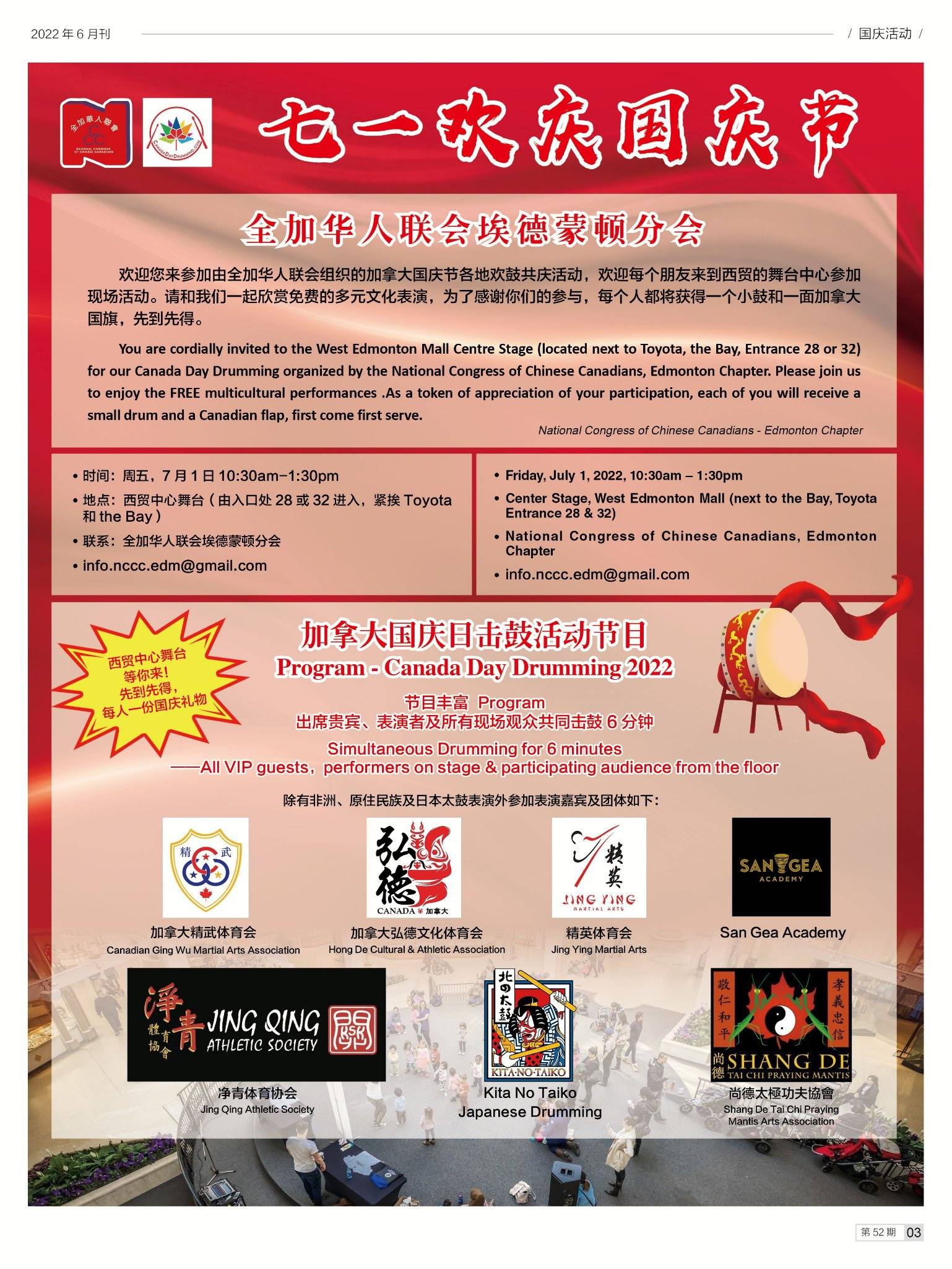 Celebrate Canada Day in Heritage Chinatown Street Market and Cultural Performances at the Edmonton Chinatown Multicultural Centre, 9540 102 Ave For more info contact the Chinese Benevolent Association 780 429 1914