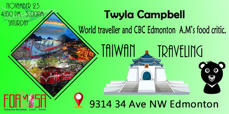 Curious about travelling to Taiwan? Join world traveller and CBC food explorer, Twyla Campbell, as she shares stories about her recent trip to Ilha Formosa, “the beautiful island.” She’ll tell you about places to visit, foods to eat, tourist attractions you shouldn’t miss and tips on public transportation, budgeting and where to stay. The ticket … Continue reading Discover Taiwan – Taiwan Traveling